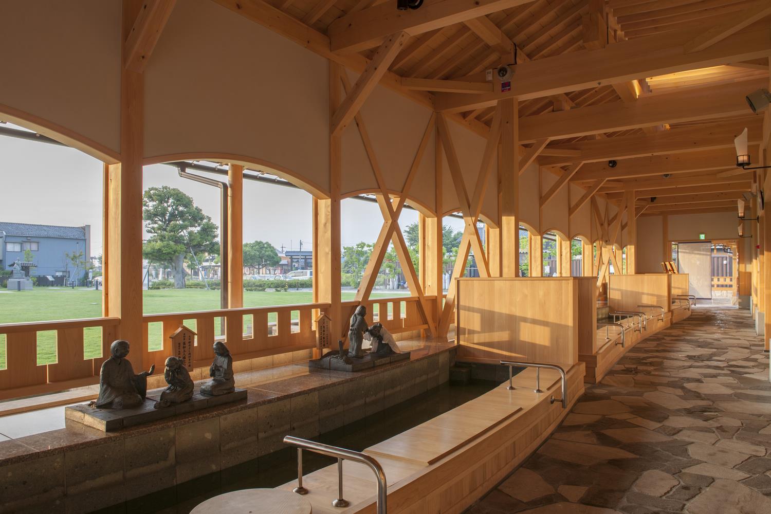 福井県産の笏谷石(しゃくだにいし)をふんだんに使用した、総ひのき造りの北陸一上質な足湯です。