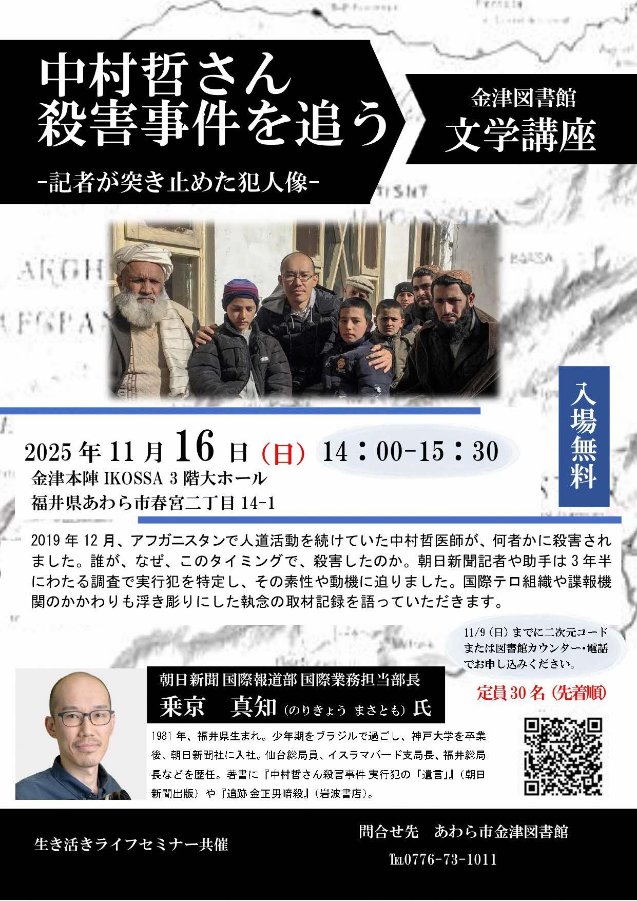 イベント名 | 金津図書館文学講座「中村哲さん殺害事件を追う ―記者が突き止めた犯人像―」 |