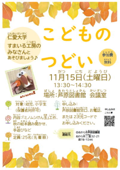 仁愛大学すまいる工房の皆さんによる、おはなし会&工作を開催します。
