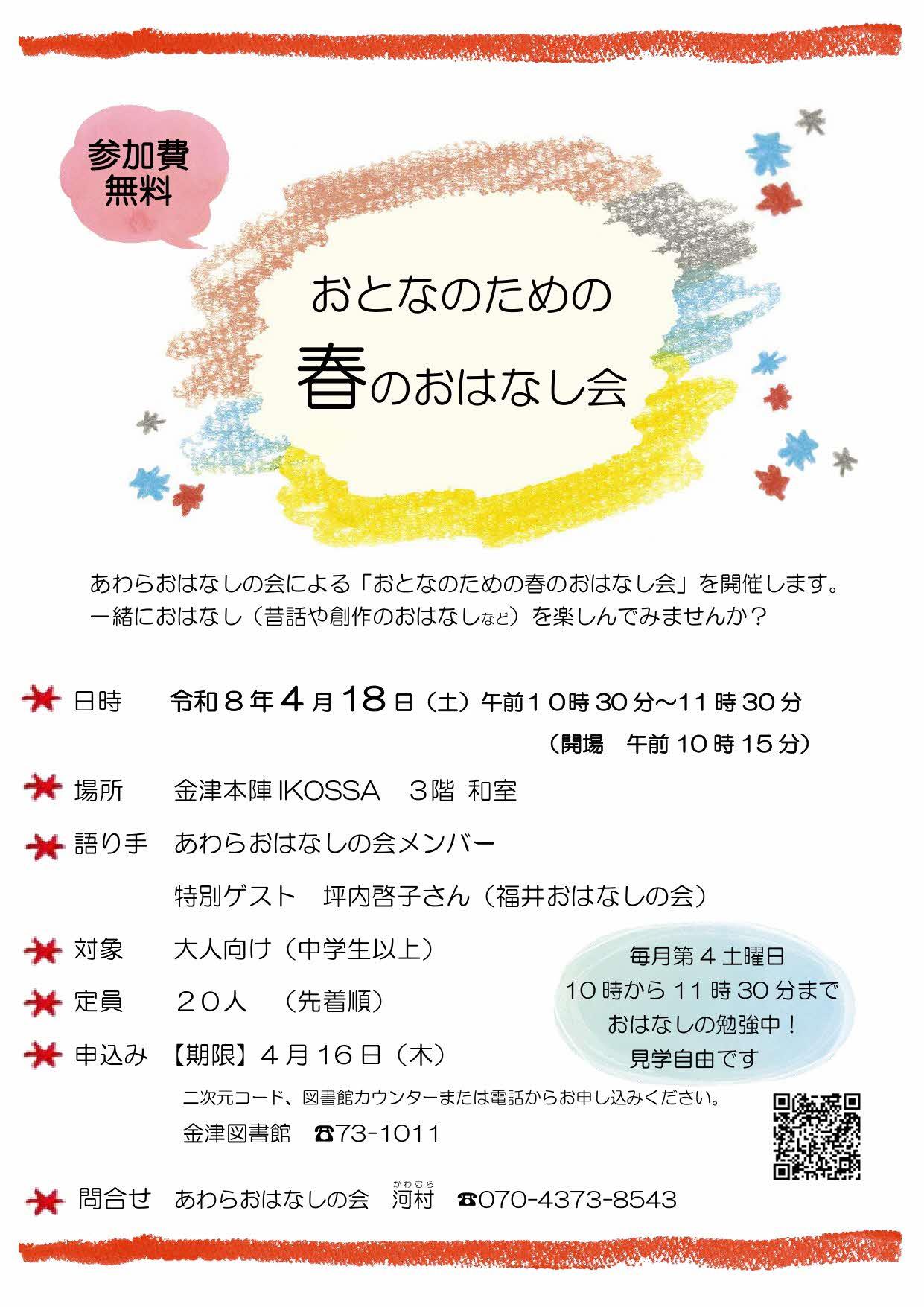 あわらおはなしの会による「おとなのための春のおはなし会」を開催します。