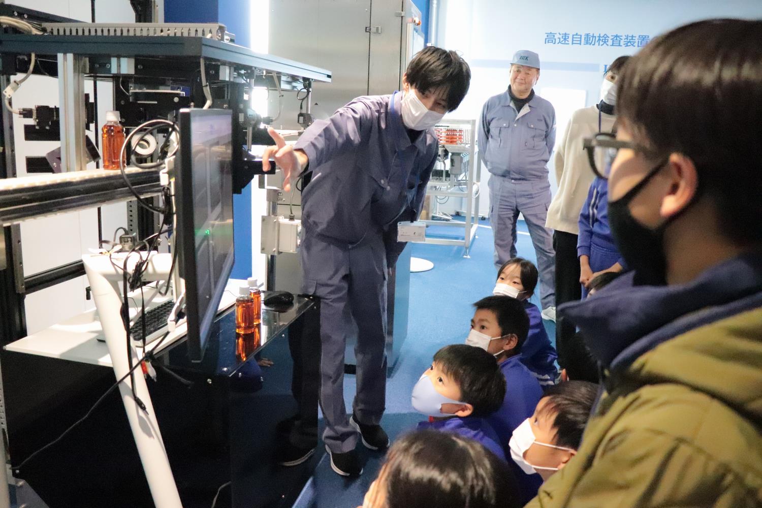 伊井小学校の4~6年生31人が、地元探検学習の一環として高嶋技研株式会社を訪問しました。同社は、ペットボトル飲料のキャップやラベルの汚れ、中身の量などを検査する「高速自動検査装置」や、回収された食品トレイを材質で分別する装置を製造しており、全国で活躍しています。児童たちは、工場見学や検査装置のデモンストレーションを体験し、地元企業が誇るものづくりの工夫や精密さを学び、技術の高さを実感していました。