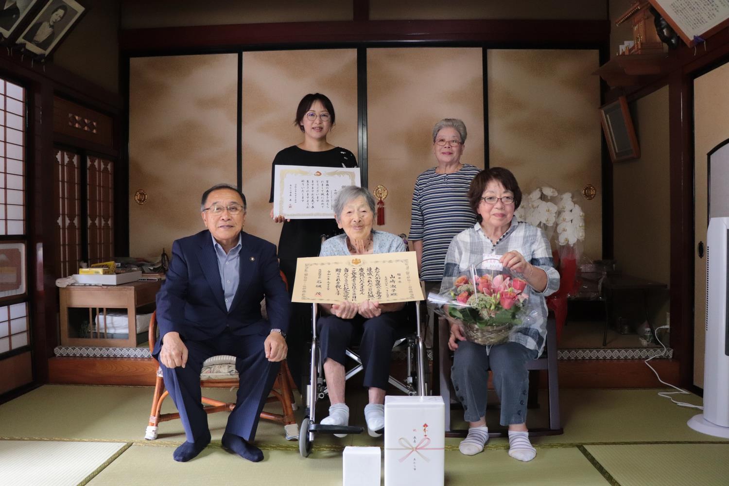 森市長は、市内で100歳を迎える13人のうち、山崎淑子さんと玉木初枝さんの自宅を訪問し、長寿のお祝いを贈りました。