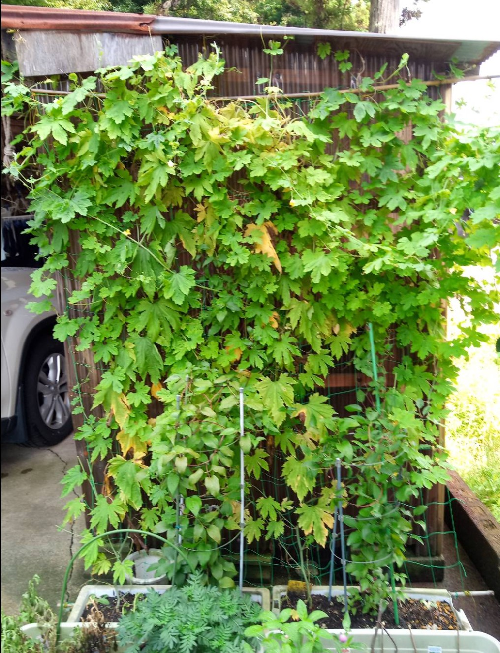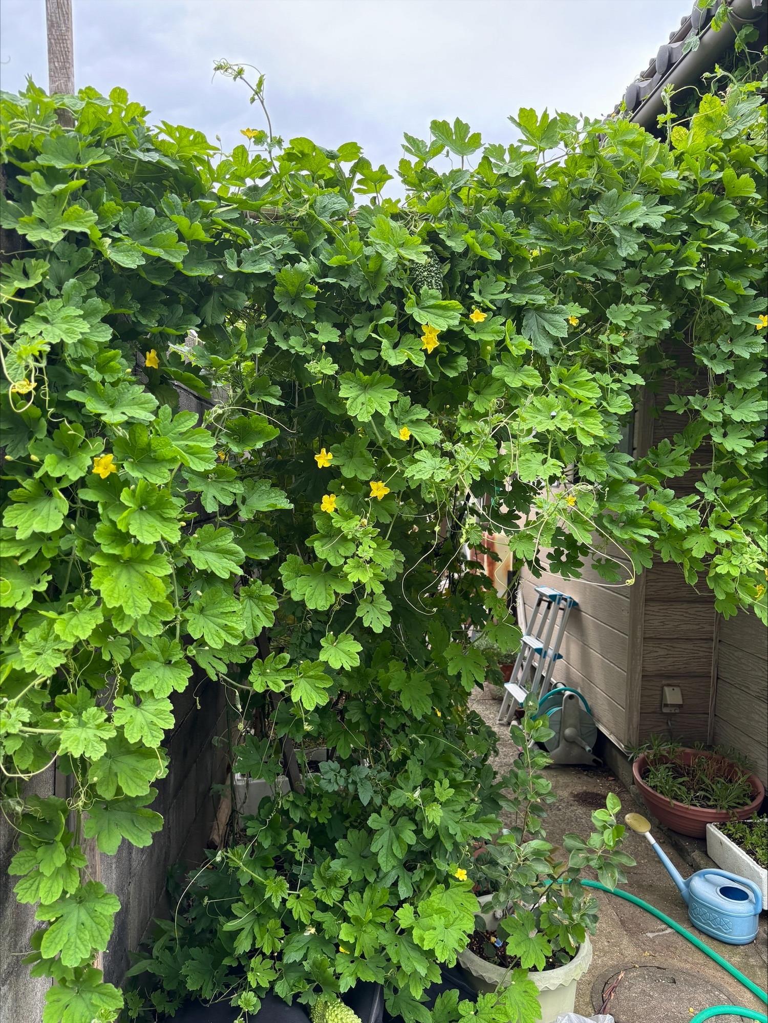 今年も西陽対策で繁らせました。去年はしなかったけどツルの先端を摘芯してみた。うまく繁ったので涼しい部屋に成りました。来年もよろしくお願いします。有りがとうございました。